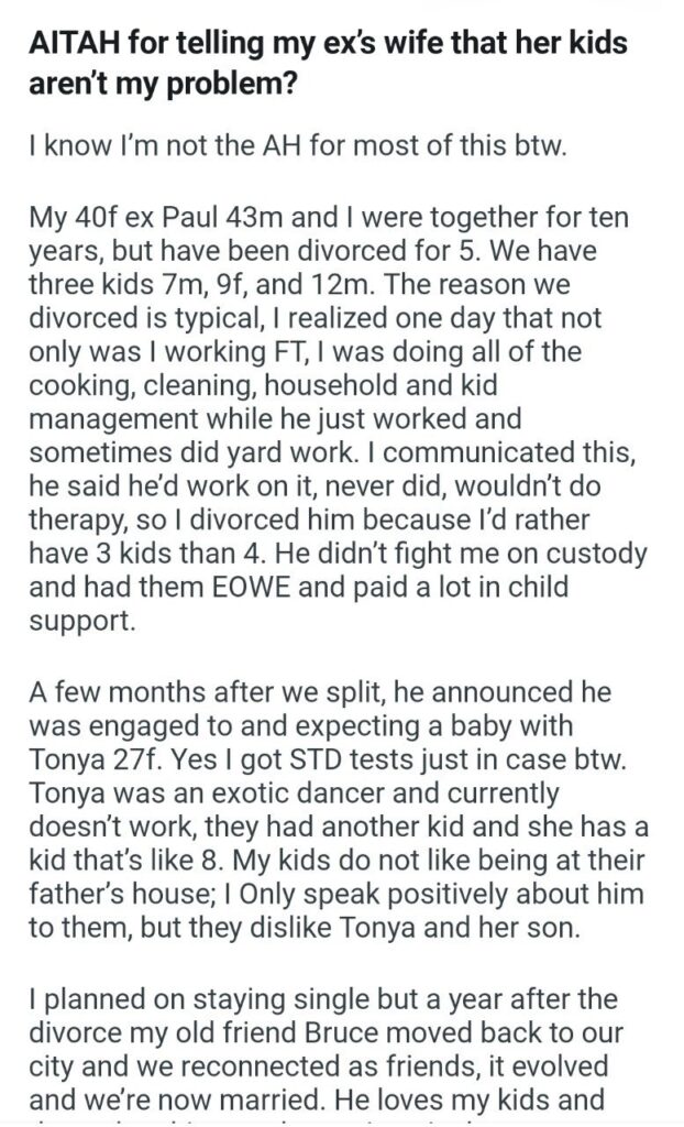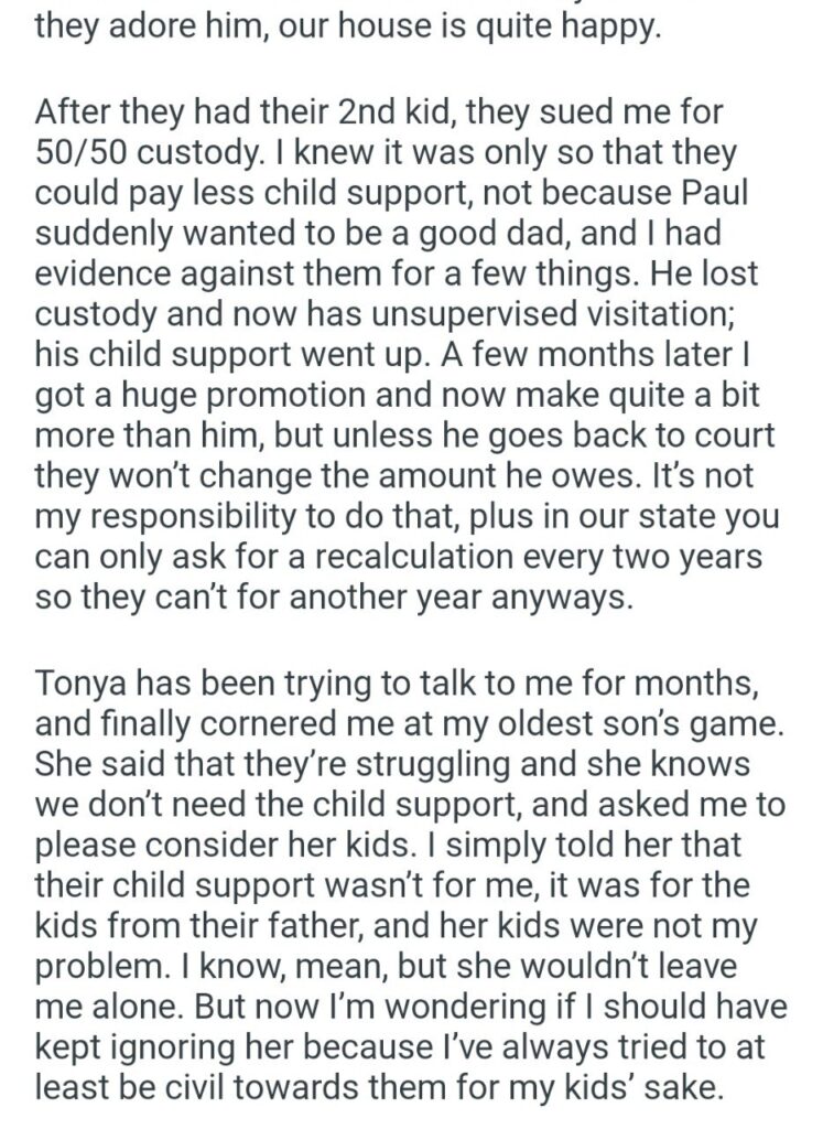 Tonya told the narrator that they are struggling financially. She pointed out that she knows the narrator “doesn’t need” the child support because she makes good money now. And then, she asked the unthinkable: she asked the narrator to “please consider her kids.” She essentially asked a mother to take money out of her own children’s savings to subsidize the family her ex-husband started after he failed the first one.