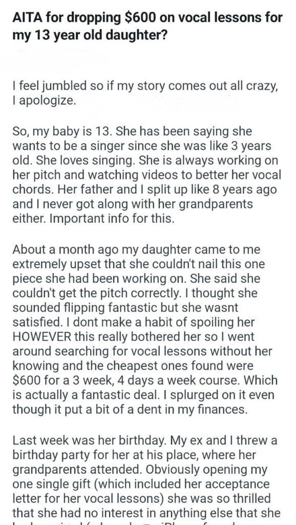 The reveal happened at a birthday party hosted by her ex-husband and his parents. The grandparents went the flashy route. They bought the 13-year-old a brand new iPhone. The dad gave her a mani/pedi coupon. These are objectively good gifts. Expensive gifts. But when the daughter opened the envelope from her mom and saw the acceptance letter for the vocal lessons, she lost it. She was thrilled. She didn’t care about the phone. She cared about the singing.