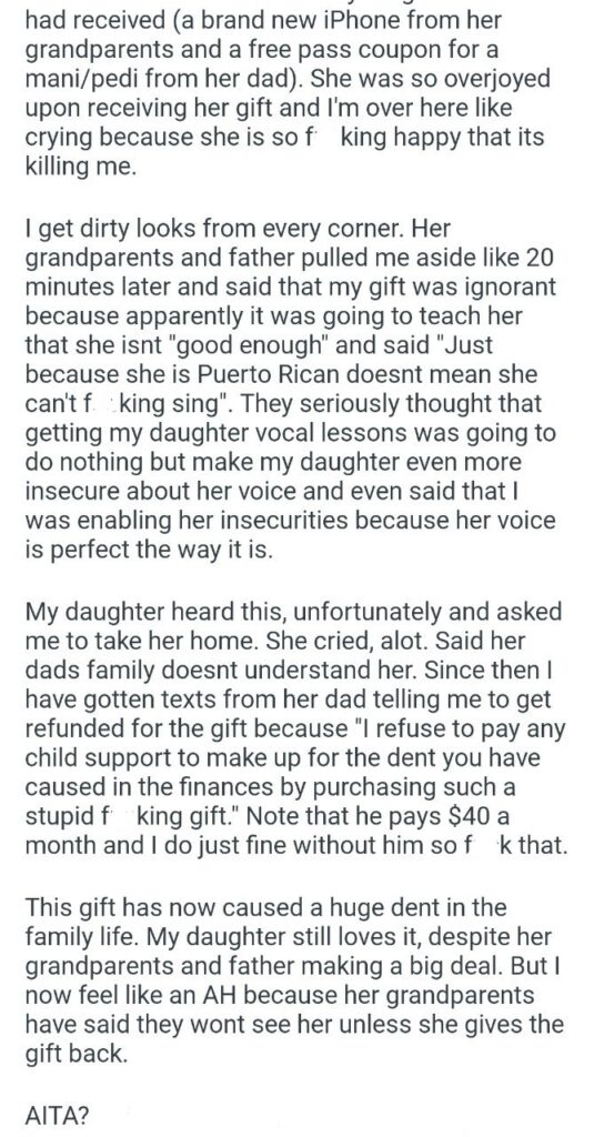 So is the mom the ahole? Absolutely not. N-T-A. You listened to your child. You validated her dreams. You gave her a gift that says “I believe in you enough to invest in your talent.” Her father and grandparents gave her gifts that said “look how much money we spent.” There is a difference, and the kid knows it. Keep the lessons. Ditch the toxicity.