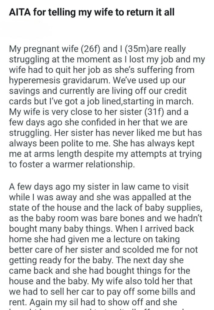 The wife, probably at her wits’ end and terrified of bringing a baby into poverty, finally confided in her older sister about how deeply they were struggling. Now, the OP notes that this sister-in-law has never liked him and keeps him at arm’s length. Honestly, after reading what happens next, I kind of see why. The sister came over, saw the destitute state of their lives, and immediately switched into crisis management mode. First, she gave the husband a lecture on taking better care of her sister and preparing for the baby, which honestly seems fair given the circumstances.