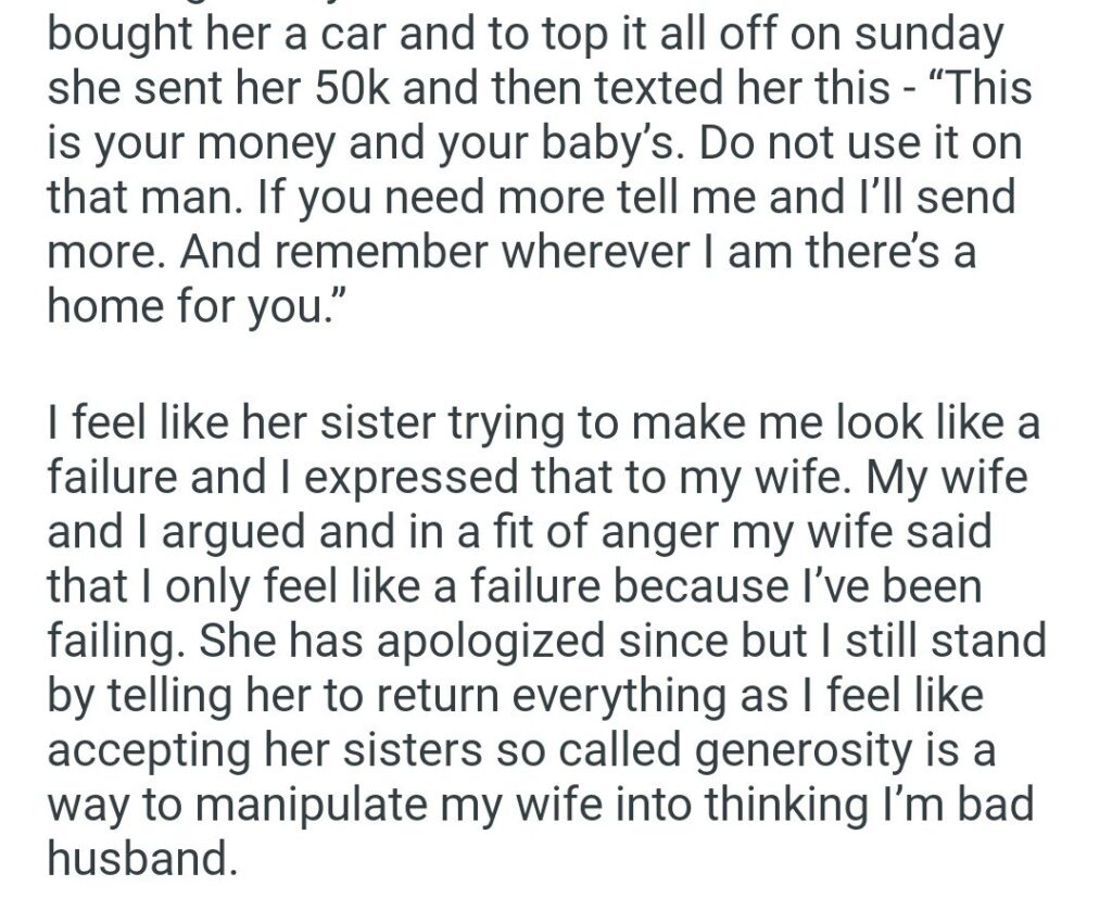 Even after she apologized for saying it out loud, the husband is doubling down. He is actually demanding that his wife return everything. He wants her to give back the baby supplies, return the car, and wire back the fifty thousand dollars. He would rather his wife be stressed, carless, and broke than accept help from someone who doesn’t like him.