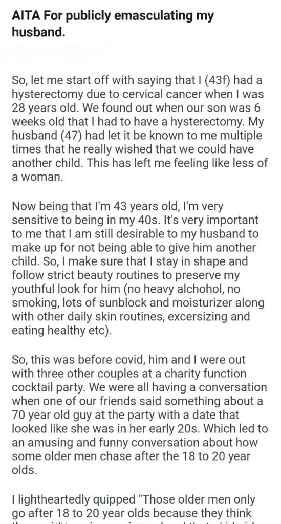 The original poster (OP) has a heartbreaking backstory that is crucial to understanding why this incident was so nuclear. When she was just 28 years old, right after having her son, she was diagnosed with cervical cancer and had to have a hysterectomy. That is traumatizing enough on its own, but her husband (now 47) has spent years making “multiple” comments about wishing they could have another baby. Way to read the room, buddy.