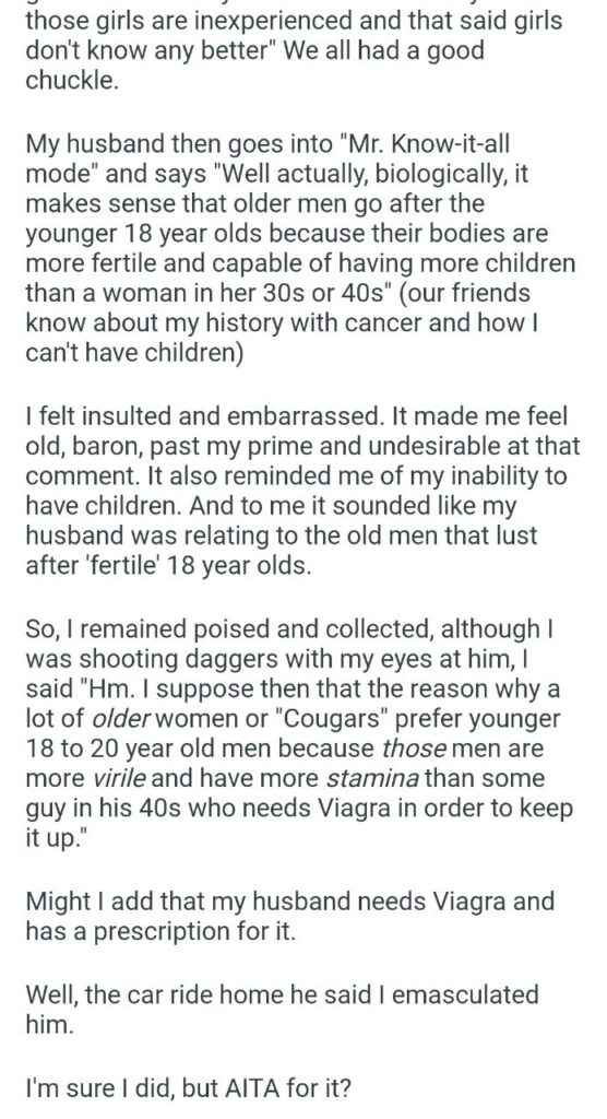 But then, her husband decided to enter “Mr. Know-it-all mode.” Instead of letting the joke land, he decided to “well actually” his wife. He looked at the group and said, “Well actually, biologically, it makes sense that older men go after the younger 18 year olds because their bodies are more fertile and capable of having more children than a woman in her 30s or 40s.”